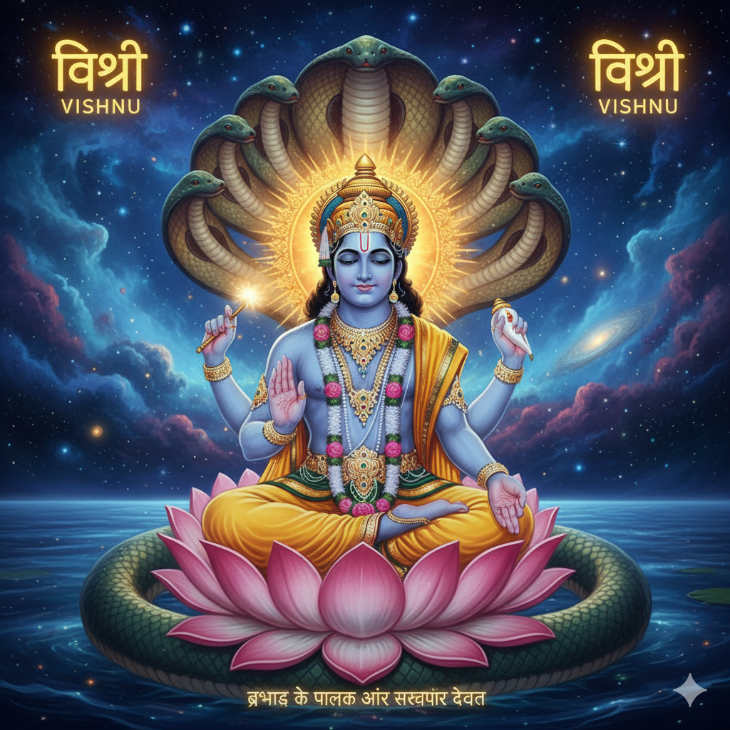 - विष्णु (Vishnu): वे ब्रह्मांड के पालक और संरक्षक देवता हैं। जब भी धर्म की हानि होती है, वे विभिन्न अवतारों (जैसे राम, कृष्ण) में पृथ्वी पर अवतरित होते हैं। उन्हें अक्सर नीले रंग के, शंख, चक्र, गदा और कमल धारण किए हुए दर्शाया जाता है।
