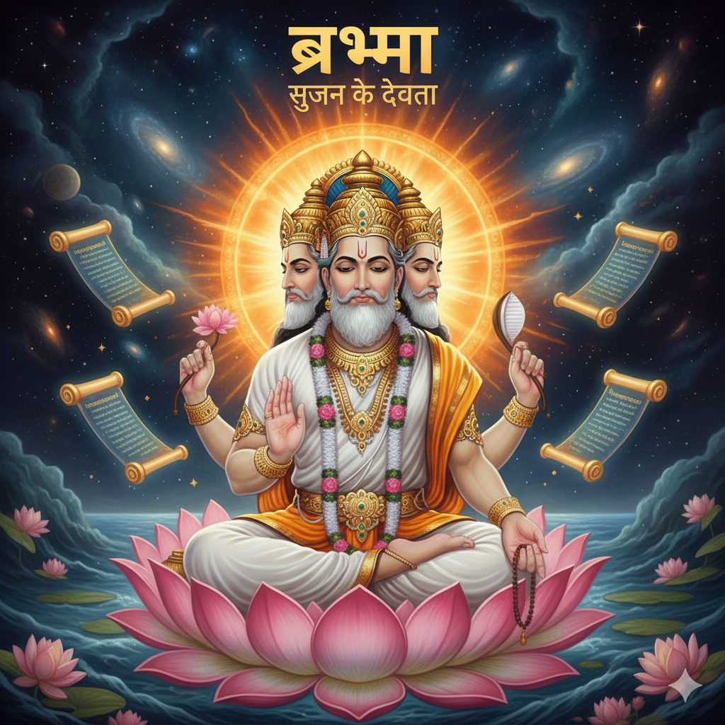 - ब्रह्मा (Brahma): वे सृजन के देवता हैं। वे ब्रह्मांड के निर्माता के रूप में जाने जाते हैं। उन्हें अक्सर चार मुखों के साथ दर्शाया जाता है, जो चारों वेदों का प्रतीक हैं।