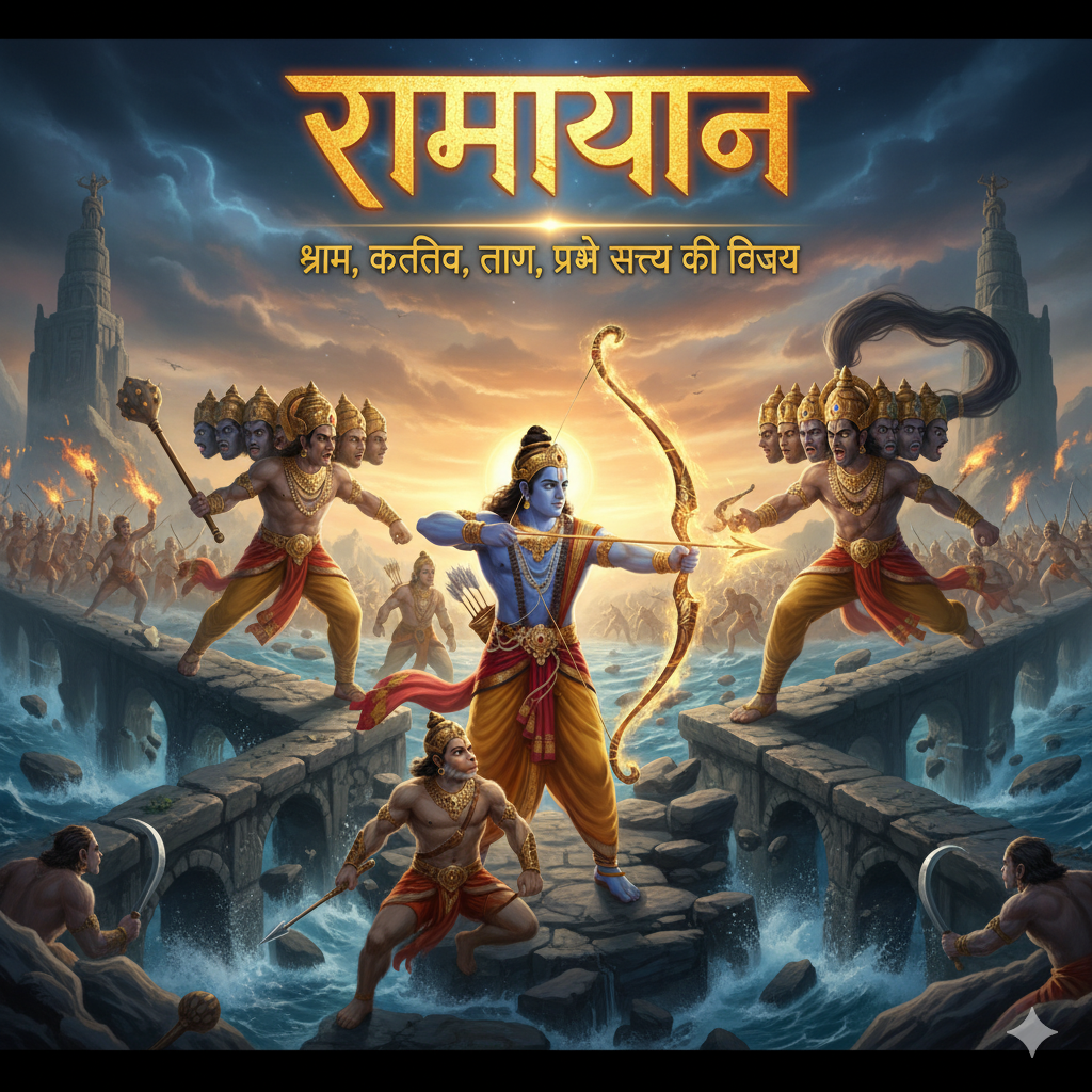 - रामायण (Ramayana): यह भगवान राम के जीवन, उनके आदर्शों, सीता हरण, हनुमान की भक्ति और रावण के वध की महागाथा है। यह कहानी हमें धर्म, कर्तव्य, त्याग, प्रेम और सत्य की विजय का पाठ पढ़ाती है। राम को ‘मर्यादा पुरुषोत्तम’ कहा जाता है, जो एक आदर्श पुत्र, भाई, पति और राजा के रूप में प्रस्तुत होते हैं।