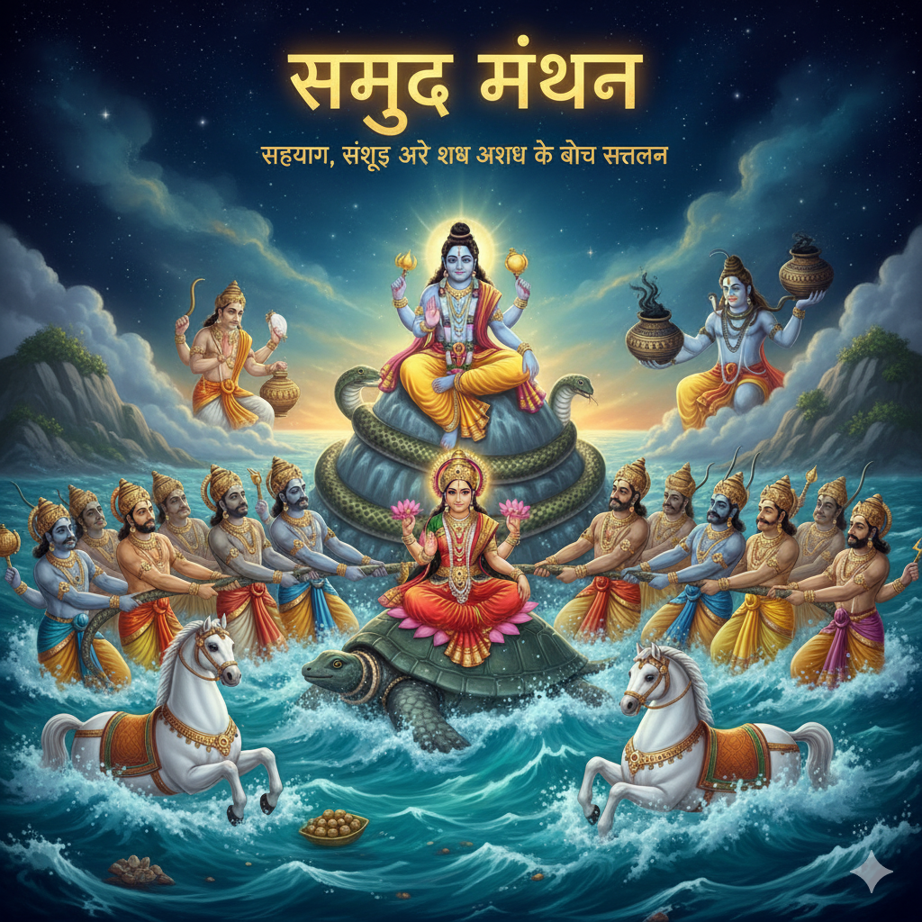 - समुद्र मंथन (Samudra Manthan): यह देवताओं और असुरों द्वारा अमृत प्राप्त करने के लिए समुद्र को मथने की कथा है। इस मंथन से कई रत्न, विष (हलाहल), लक्ष्मी और अमृत निकला। यह कहानी हमें सहयोग, संघर्ष और शुभ-अशुभ के बीच संतुलन का महत्व सिखाती है।