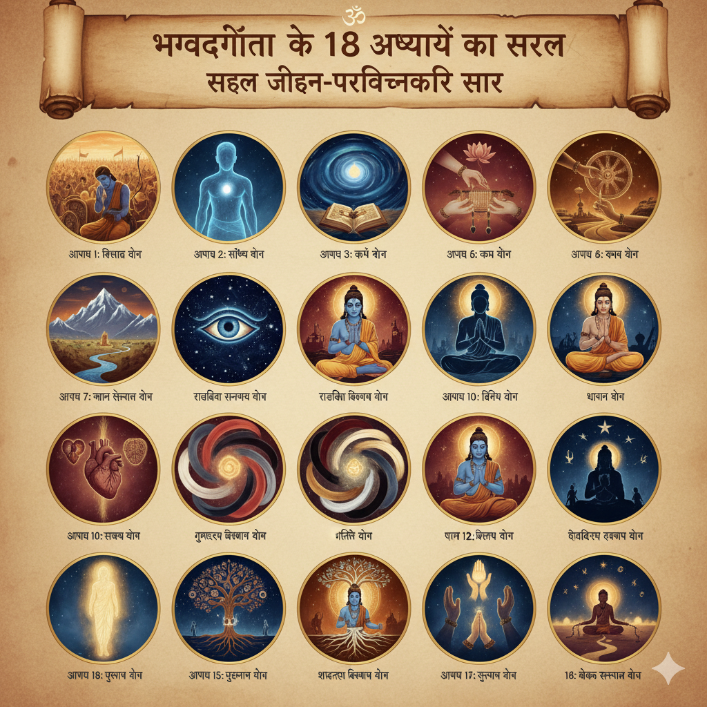 आइए, इन 18 अध्यायों के सरल और जीवन-परिवर्तनकारी सार को समझते हैं: